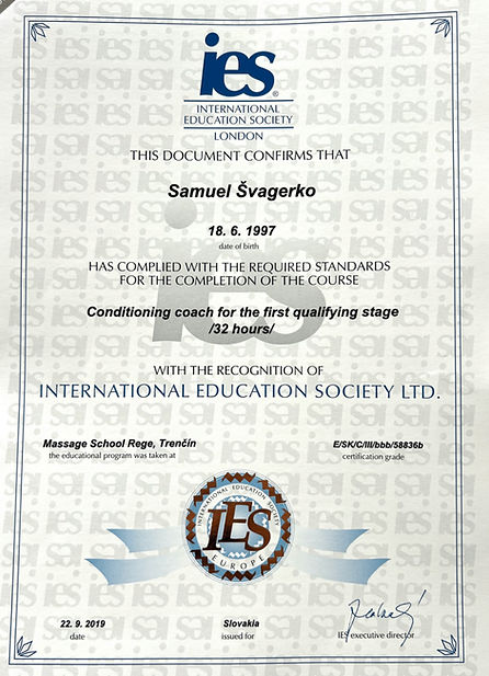 Translation Calisthenics Certification by Efect Fit Academy attended for 7 hours Date of Completion: November 10th 2019 Instructor: Damián Vizár (IG - @mr._muscle_up) Notable courses/schools without official certification: Conditioning Coaching at the Faculty of Physical Education and Sport, Comenius University in Bratislava, Calisthenics Course of 1. Degree, Medicine Ball Course, DNS Diagnosis Lessons